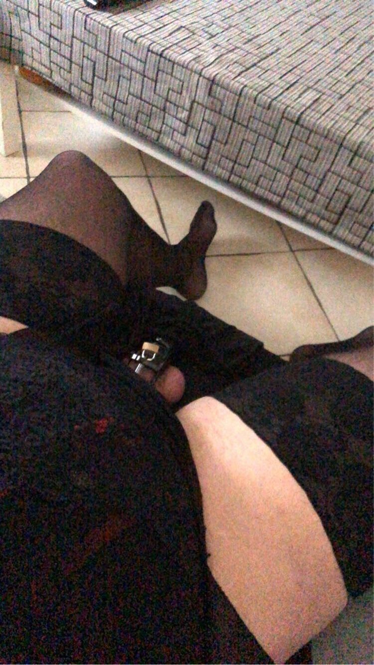 Lope en cage de chasteté et lingerie sexy.