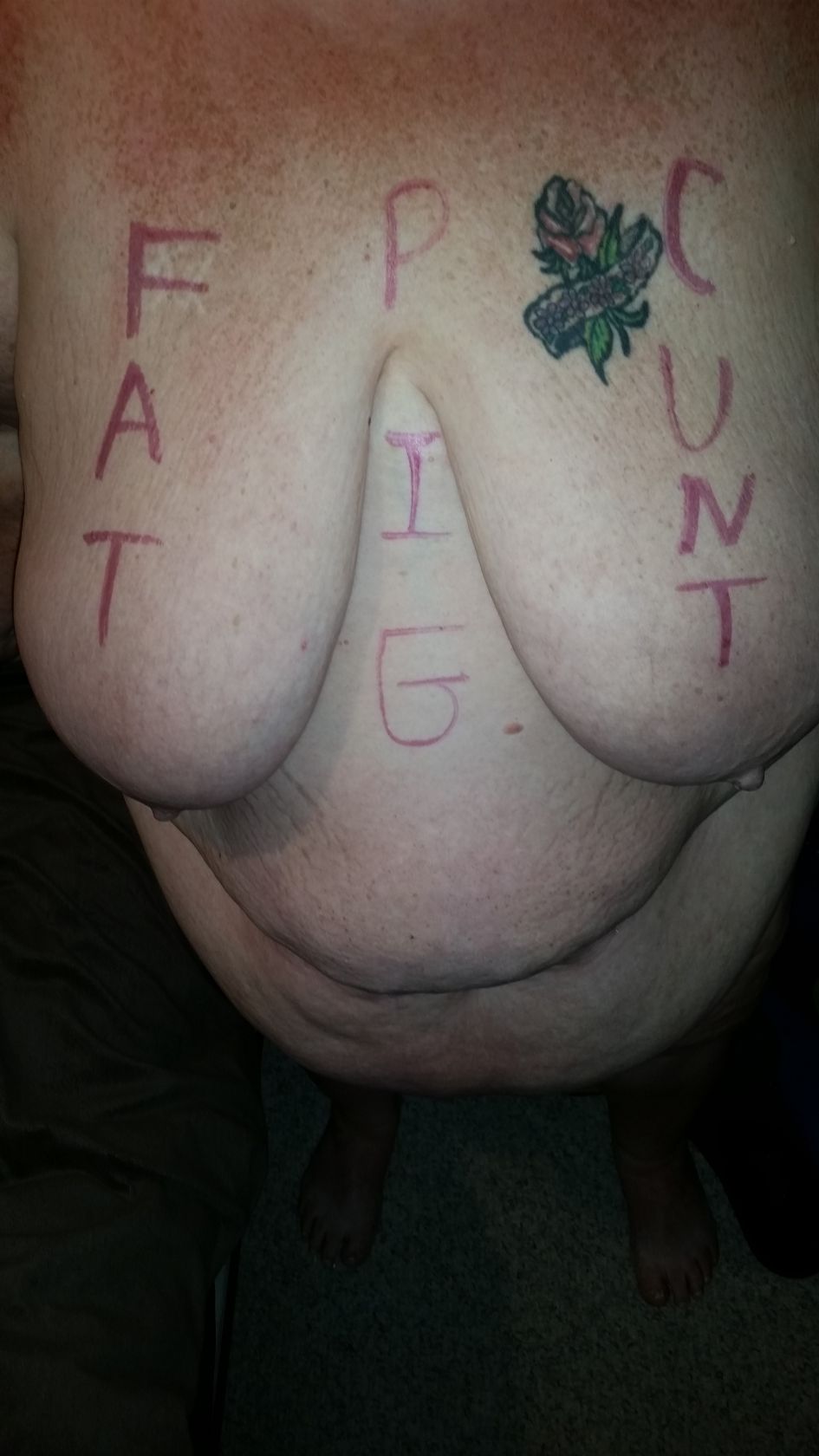 I am a nasty fat pig that is here under instruction from my owner who wishes to have me shown off. As you can see from my pics I am very fat and my tits sag. My owner doesn't let me shave my Cunt, so that's just going to get hairier. I hope you like my pics, and my owner welcomes all comments.
